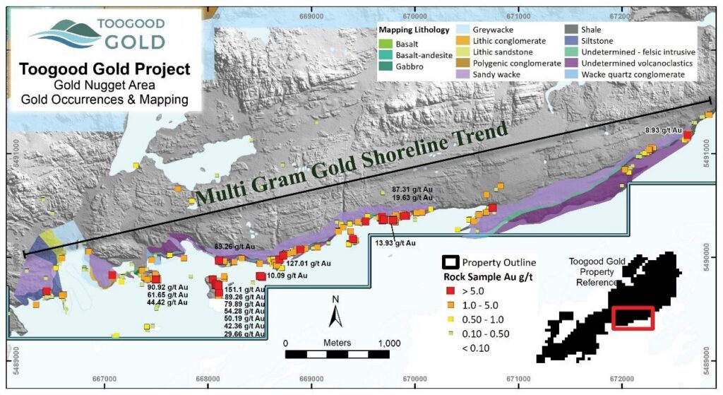 - High-grade gold up to 76.89 g/t confirmed, with additional results of 4.88 g/t and 4.49 g/t Au confirmed along the 8.5 km Shoreline gold trend (Figure 2), demonstrating district-scale potential;