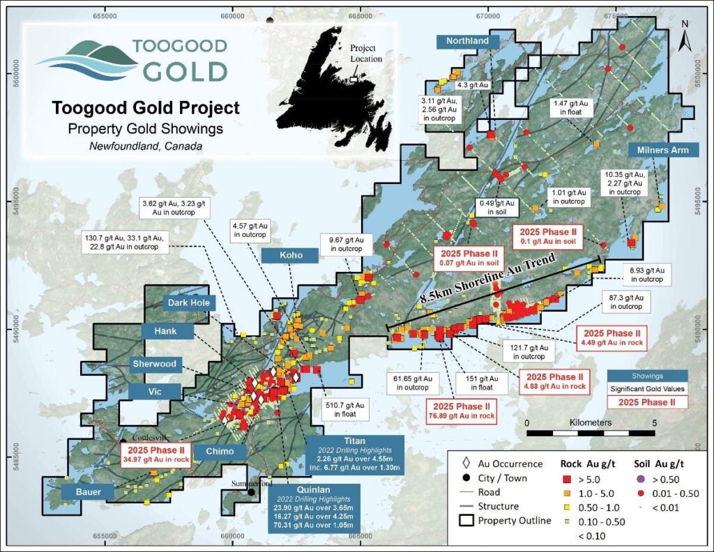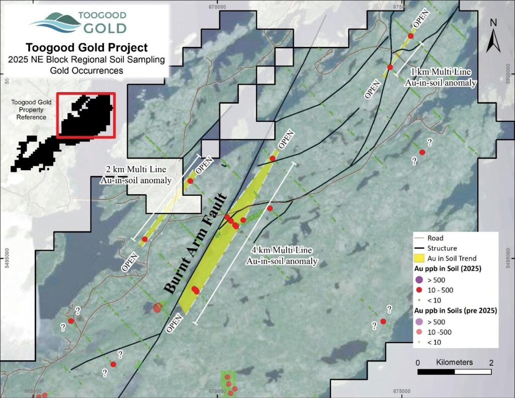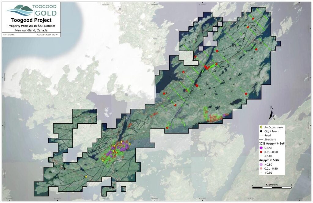 “Phase 2 results continue to demonstrate the scale and prospectivity of the Toogood Gold Project, with high-grade gold confirmed along an 8.5-kilometre-long trend and multiple kilometre-scale soil anomalies defined from regional sampling,” stated Colin Smith, CEO of Toogood Gold Corp. “The strong alignment between surface mineralization, coherent geochemical signatures, and well-defined structural controls, including key lithological contacts and district-scale faults, provides a robust targeting framework to define and advance a growing pipeline of high-quality drill target corridors.”