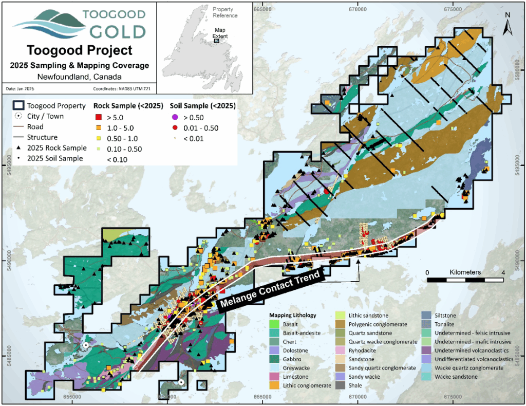 Vancouver, BC, January 13, 2026 – Toogood Gold Corp. (TSXV: TGC; OTCQB: TGGCF; FSE: D3P) (“Toogood” or the “Company”) today reported final drilling assays at its 100%-owned Toogood Gold Project (“Toogood” or the “Project”), located on New World Island in the mining-friendly jurisdiction of Newfoundland, Canada.