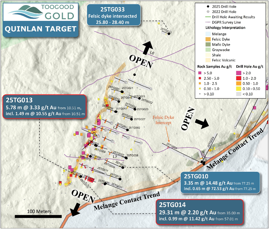 - Priority expansion direction defined: The strongest 2025 intercept at Quinlan (25TG014: 29.31 m @ 2.20 g/t Au from 35.00 m) was intersected at the southwestern extent of drilling, establishing this open strike direction as a high priority trend for the next phase of drilling;