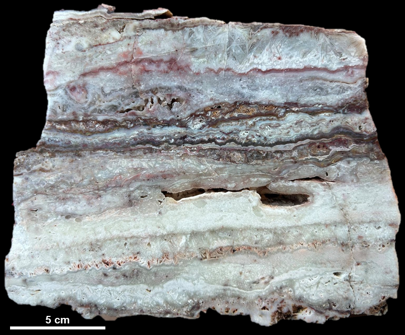 Figure 3: Vein material from outcropping vein at Table Mountain displaying crustiform-colloform banded chalcedony and fine-grained quartz textures with silicified bladed (platy) calcite, consistent with an upper-level low-sulphidation epithermal environment.